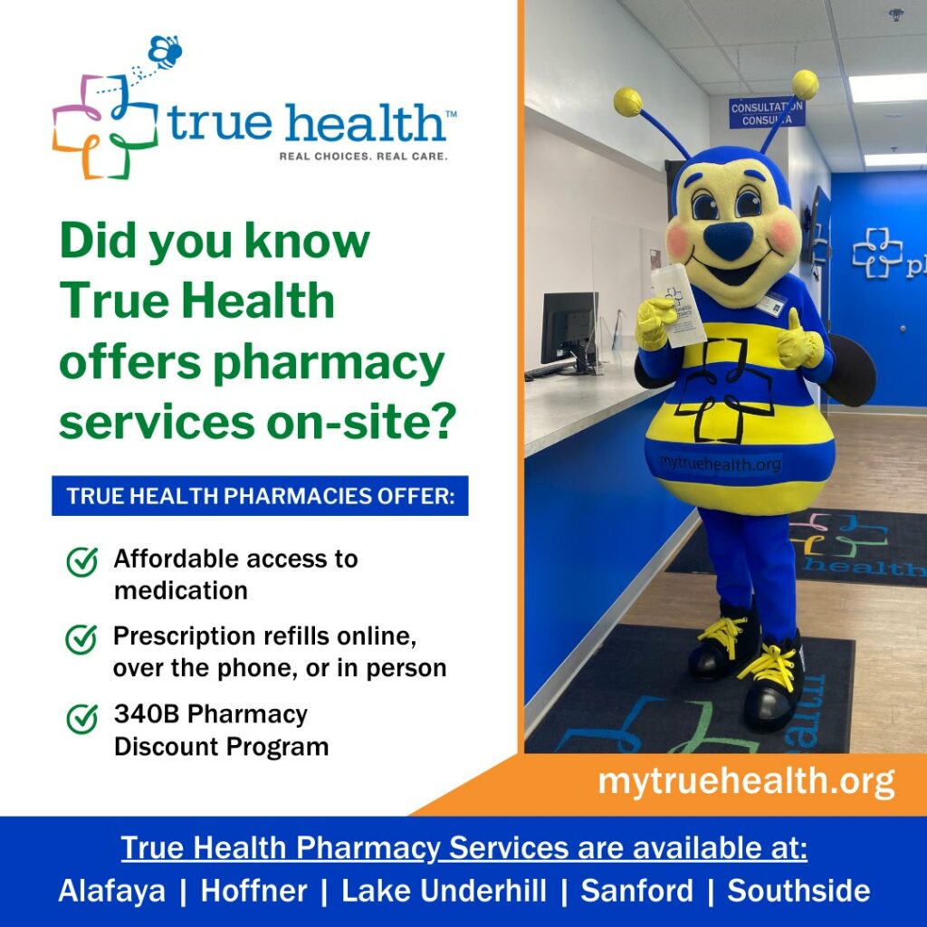 Did you know True Health offers pharmacy services on-site? Our pharmacies provide affordable access to medication, convenient prescription refills, and the 340B Pharmacy Discount Program. Learn more at mytruehealth.org or ask about our pharmacies during your next visit!