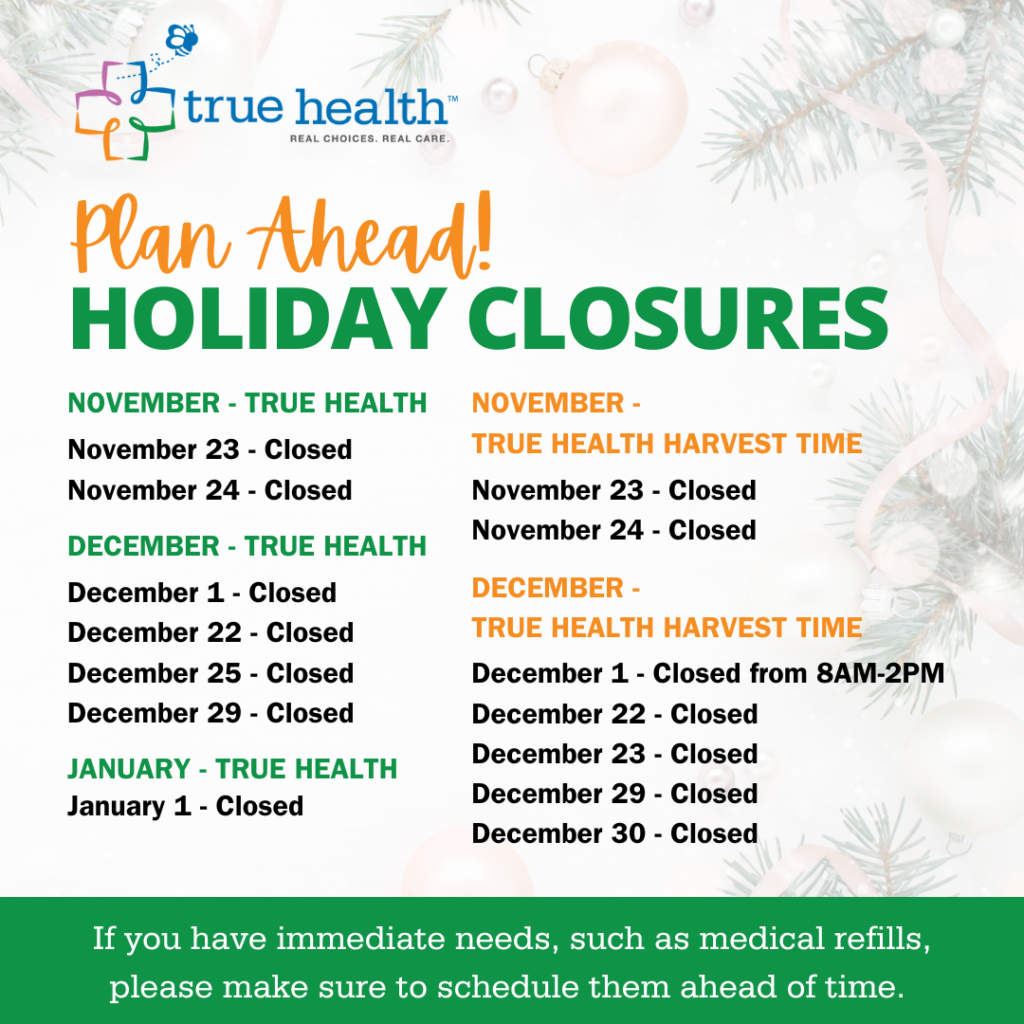 Holiday Closures Be prepared this holiday season by planning ahead. Please see dates above for True Health holiday closures and Be sure to schedule your appointments and plan ahead for medical refills. […]