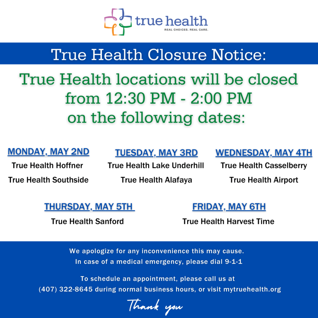 Closure Notice: True Health locations will close from 12:30 PM – 2 PM on certain days next week for staff meetings. *Not all locations will be closed each […]