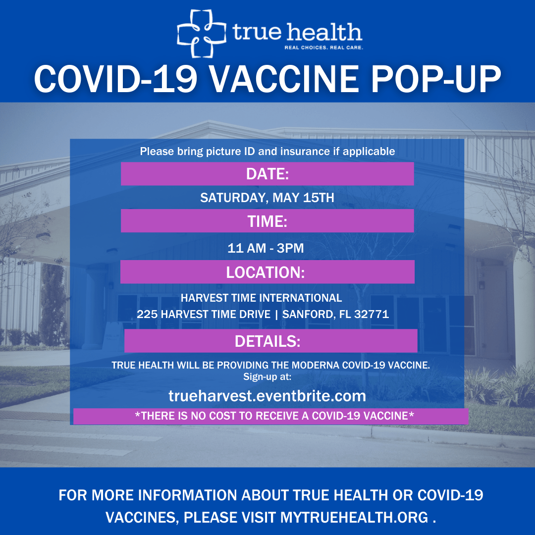 On Saturday, May 15th from 11AM -3 PM True Health will be providing FREE Moderna COVID-19 vaccines at Harvest Time International in Sanford, FL.