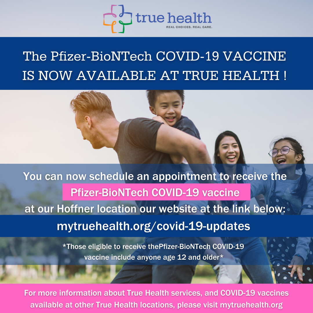 You can now self-schedule to receive the Pfizer COVID-19 vaccine at True Health Hoffner! Appointments available beginning Tuesday, May 25th.