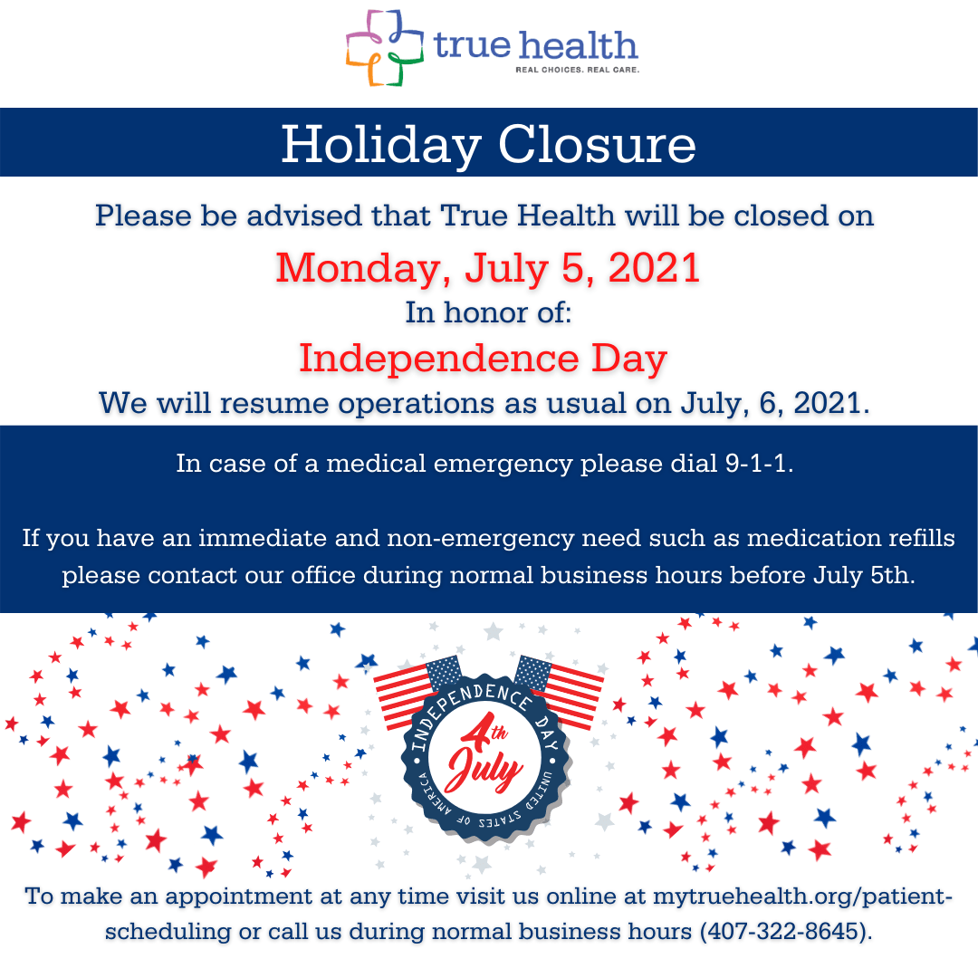 In observance of the upcoming July 4th holiday, all True Health sites will be closed on Monday, July 5th, 2021.