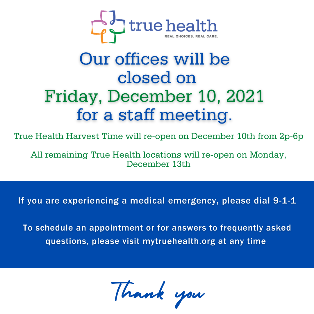 Closure Notice: On Friday, December 10th, all True Health locations will be closed for a staff meeting. True Health Harvest Time will re-open on December 10th from 2PM – 6 PM and all remaining True Health locations will re-open during their normal business hours on Monday, December 13th. If you have an immediate need such as medication refills, please contact us during normal business hours before December 10th. In case of emergency, dial 9-1-1.