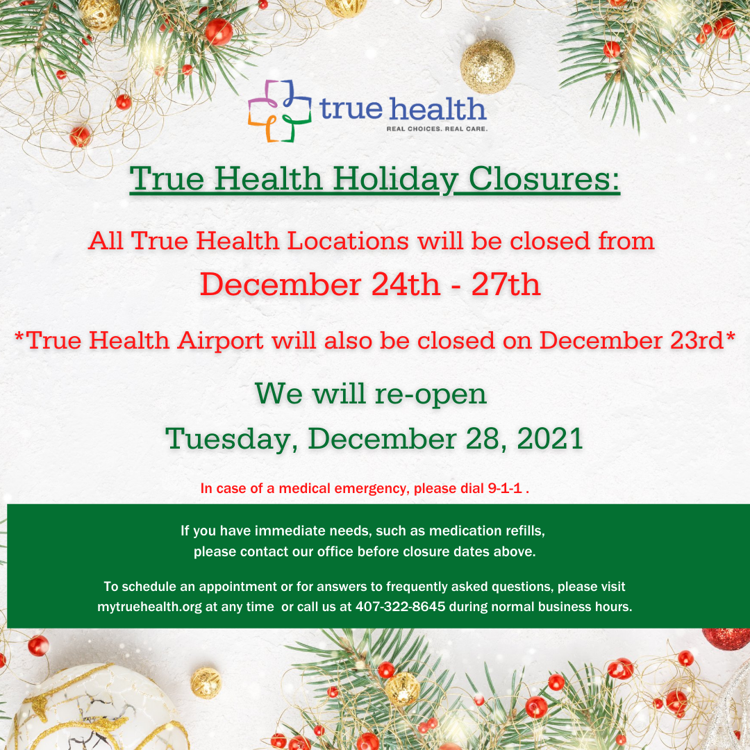 Tis’ the season for holiday closures. True Health will be closed from December 24th -27th, with our Airport location also closed on December 23rd. If you have immediate needs such as medical refills, please contact us before these dates. Appointments can be scheduled anytime on our website at mytruehealth.org or during normal business hours by calling 407-322-8645. If you are experiencing a medical emergency, please dial 9-1-1.