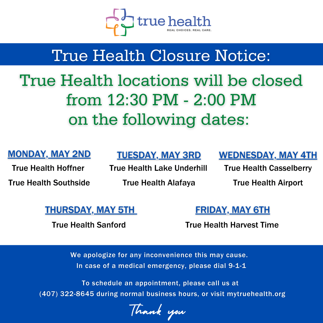 Closure Notice: True Health locations will close from 12:30 PM – 2 PM on certain days next week for staff meetings.