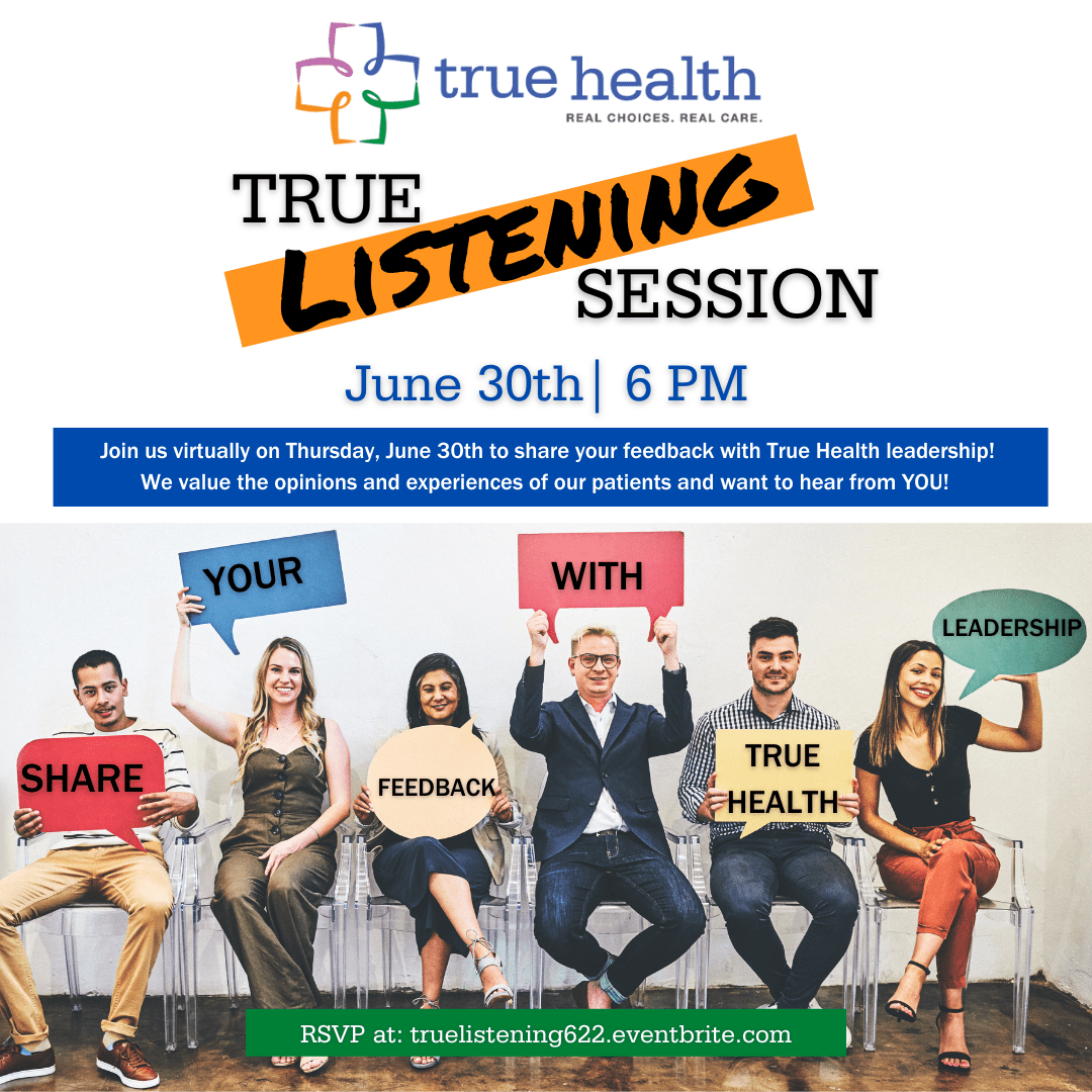 Have you been a patient at True Health in the last year? We want to hear from you and invite you to join us for our next True Listening Session June 30th at 6pm! This virtual event provides an opportunity for patients to provide valuable feedback to True Health Leadership in an intimate online setting, while also helping us to continuously improve our services, operations, and “True service”. Registration is required.