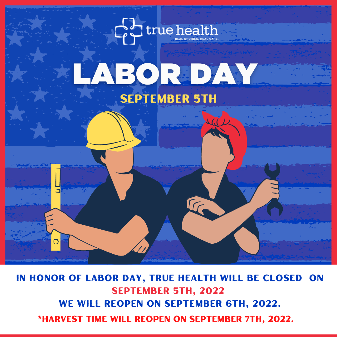 aborIn honor of Labor Day, True Health will be closed today, September 5th, 2022. We will reopen on Tuesday, September 6th. Our Harvest Time location will reopen on Wednesday, September 7th. Appointments can be self-scheduled at anytime on our website at mytruehealth.org. In case of a medical emergency, please dial 9-1-1.