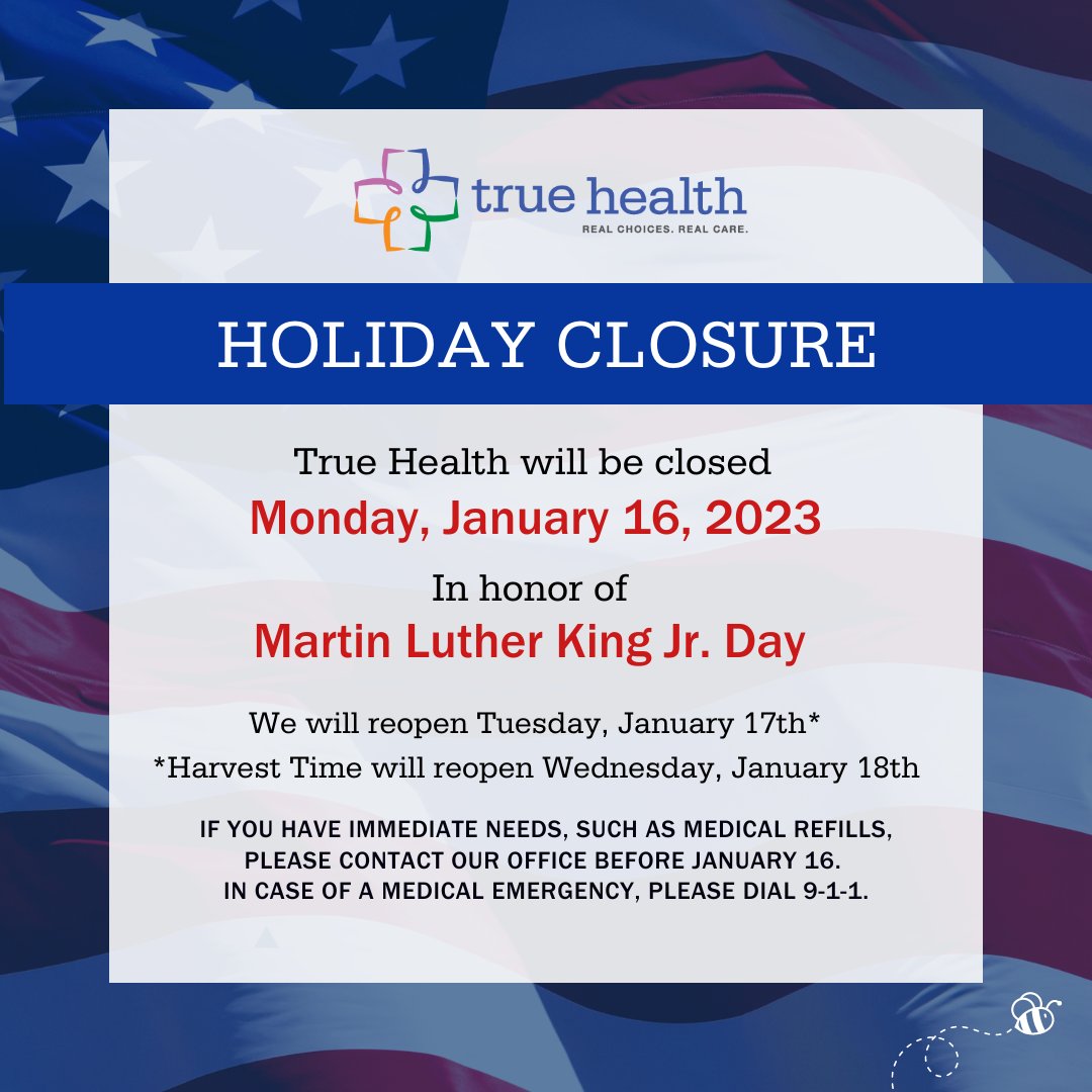 In honor of Martin Luther King, Jr. Day, True Health will be closed on Monday, January 16th. We will reopen on Tuesday, January 17th. Harvest Time will reopen on Wednesday, January 18th.