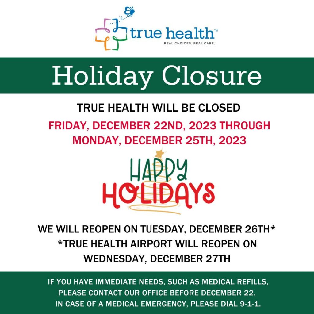 Closure Notice: True Health will be closed Friday, December 22nd, through Monday, December 25th.