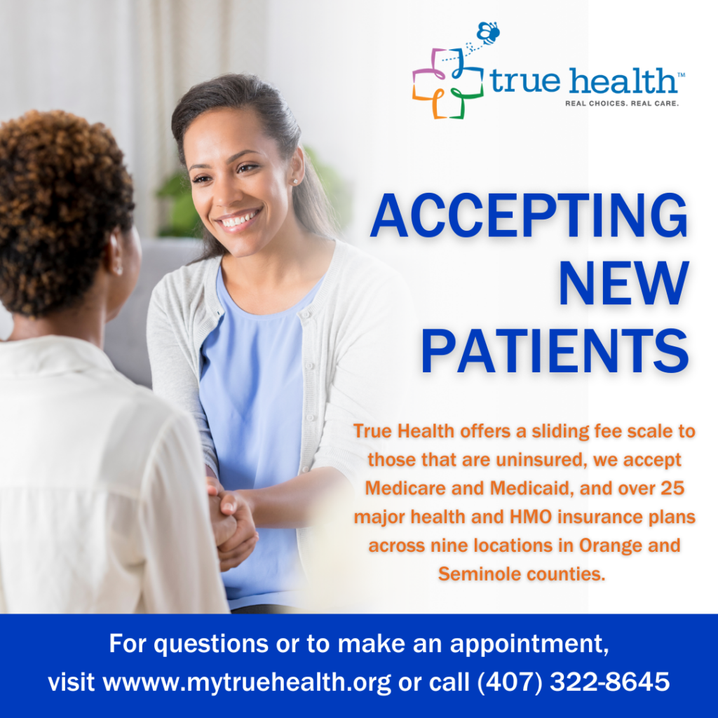 True Health is accepting new patients! We offer a sliding fee scale to those that are uninsured, and we accept Medicare, Medicaid, and over 25 major health and HMO insurance plans across nine locations in Orange and Seminole Counties.
