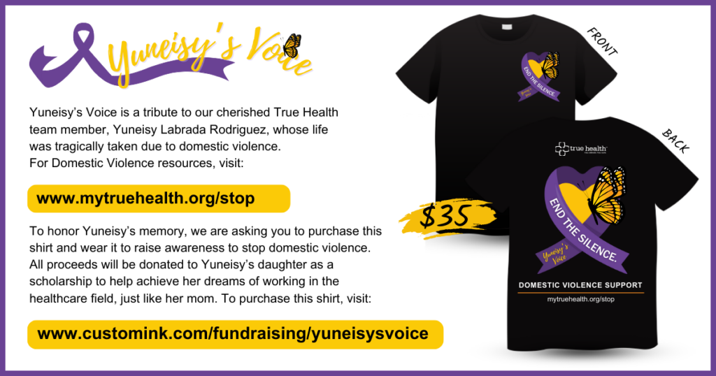 Yuneisy’s Voice is a tribute to our cherished True Health team member, Yuneisy Labrada Rodriguez, whose life was tragically taken due to domestic violence. To honor her memory, continue her legacy of kindness and strength, and raise awareness to stop domestic violence, we are asking you to purchase this shirt and wear it in solidarity with Yuneisy’s family and the True Health team. Proceeds received will be passed from True Health to Yuneisy’s daughter as a scholarship to help her achieve her dreams of working in the healthcare field like her mom. For Domestic Violence resources, visit mytruehealth.org/stop.