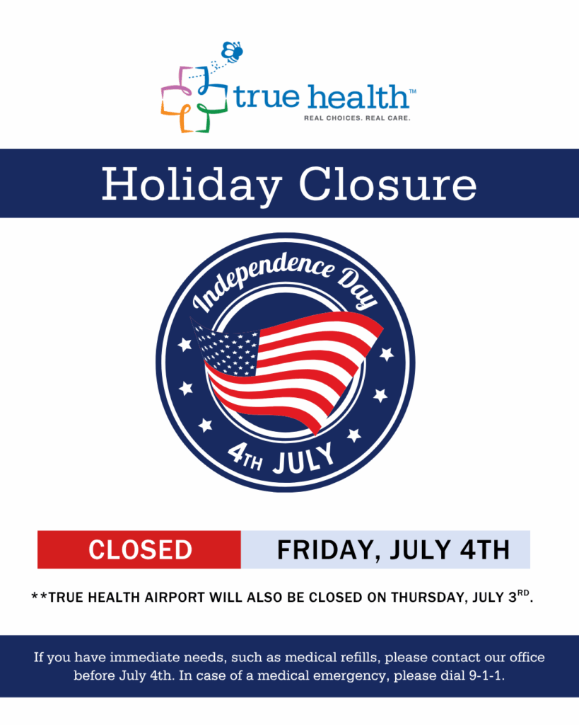 True Health will be closed on Friday, July 4th, for Independence Day. **Our True Health Airport location will be closed on both Thursday, July 3rd & Friday, July 4th. If you have immediate needs, such as medical refills, please contact our office before July 4th. In case of a medical emergency, please dial 9-1-1.