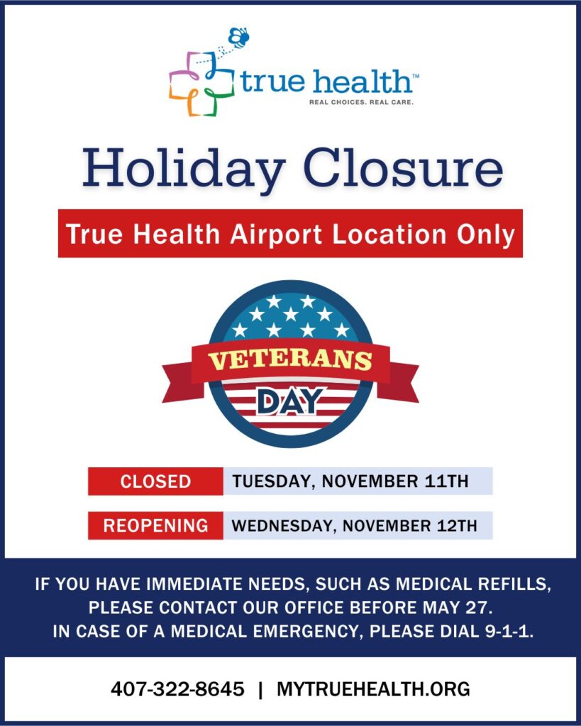 Site Closure: True Health Airport will be closed on Tuesday, November 11th, in honor of Veterans Day, reopening Wednesday November 12th. All other True Health sites will operate normal business hours.