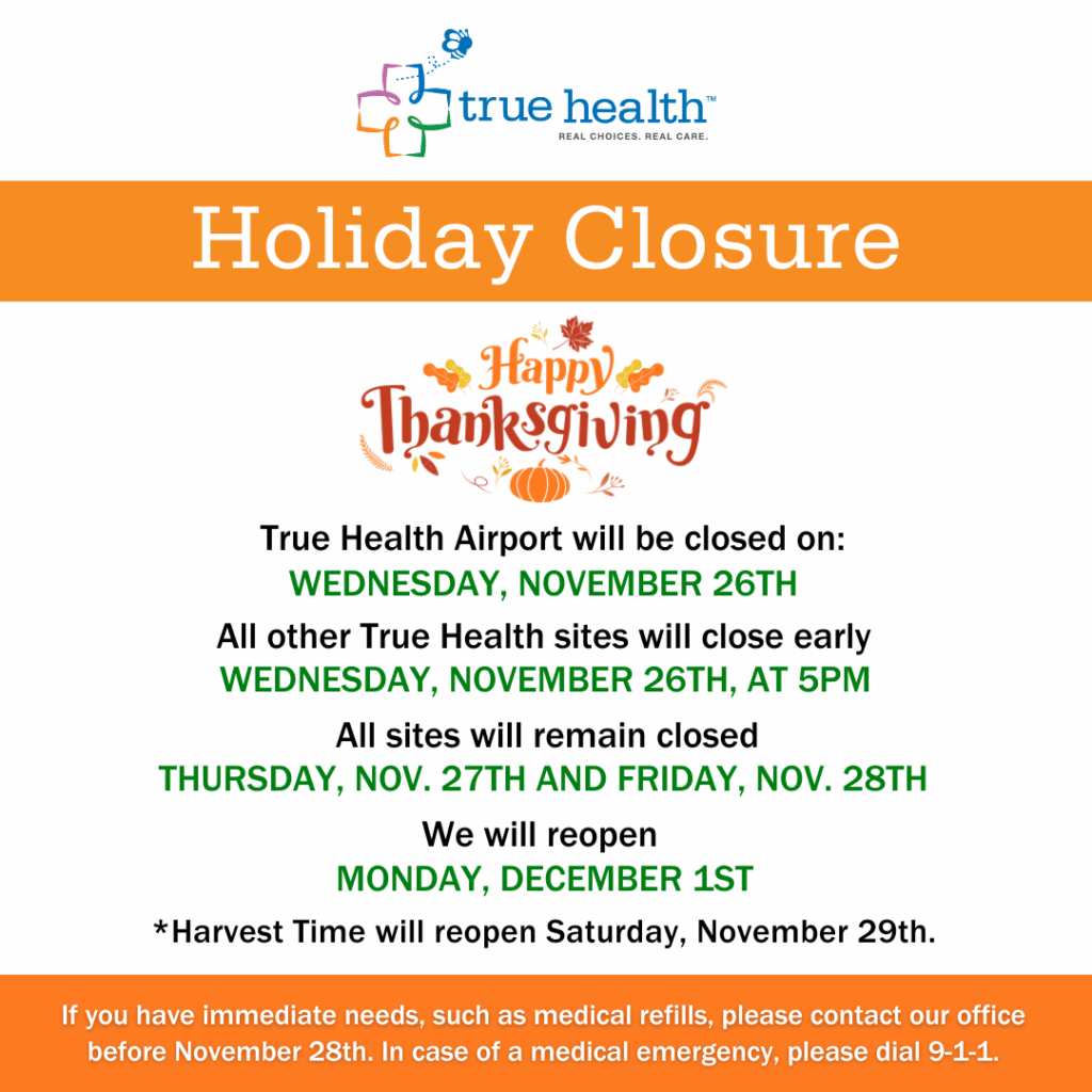 All other True Health sites will close early on Wednesday, November 26th, at 5PM.