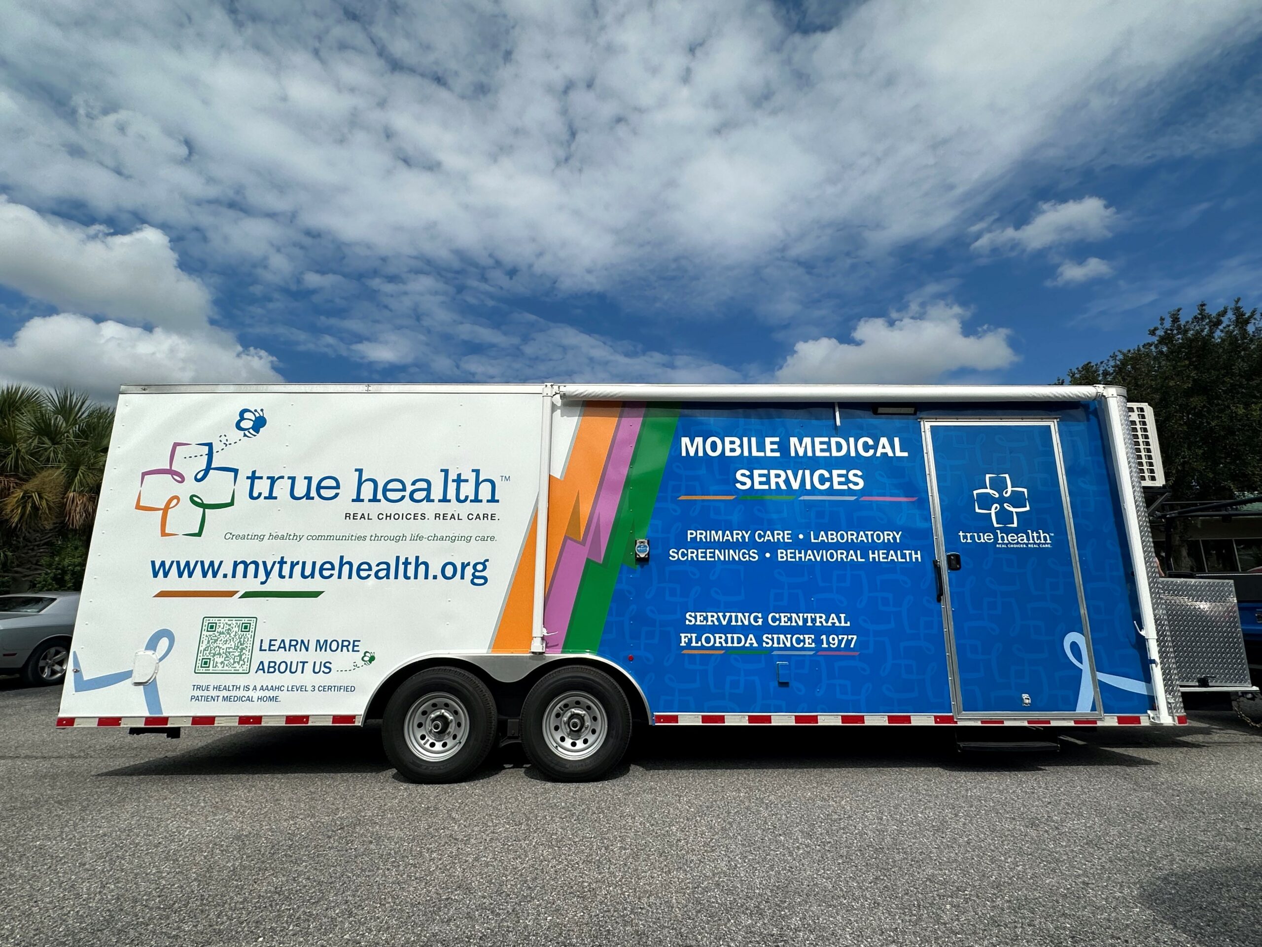 True Health’s mobile unit will be located at dfn lkmlfgvm sdg on sdfvzknjndsk.